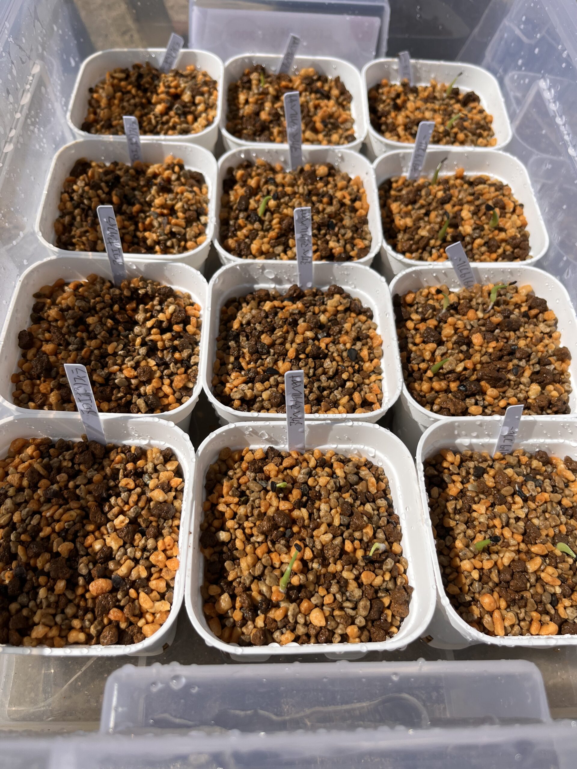9月8日 初めてアガベオテロイとパリー吉祥天の種を播種😊 用土は軽石細粒と赤玉土の小粒を1対1で配合 種子が届きすぐに播種(下処理無し)😊メネデールをチョコっと入れた水で腰水管理 置き場所は野外の明るい日陰 9月10日にはオテロイが発芽し始め 現在21日 オテロイ13個中12発芽 パリー吉祥天13個中13個発芽しました。アガベ初心者これからの管理❓とりあえず頑張ります😃