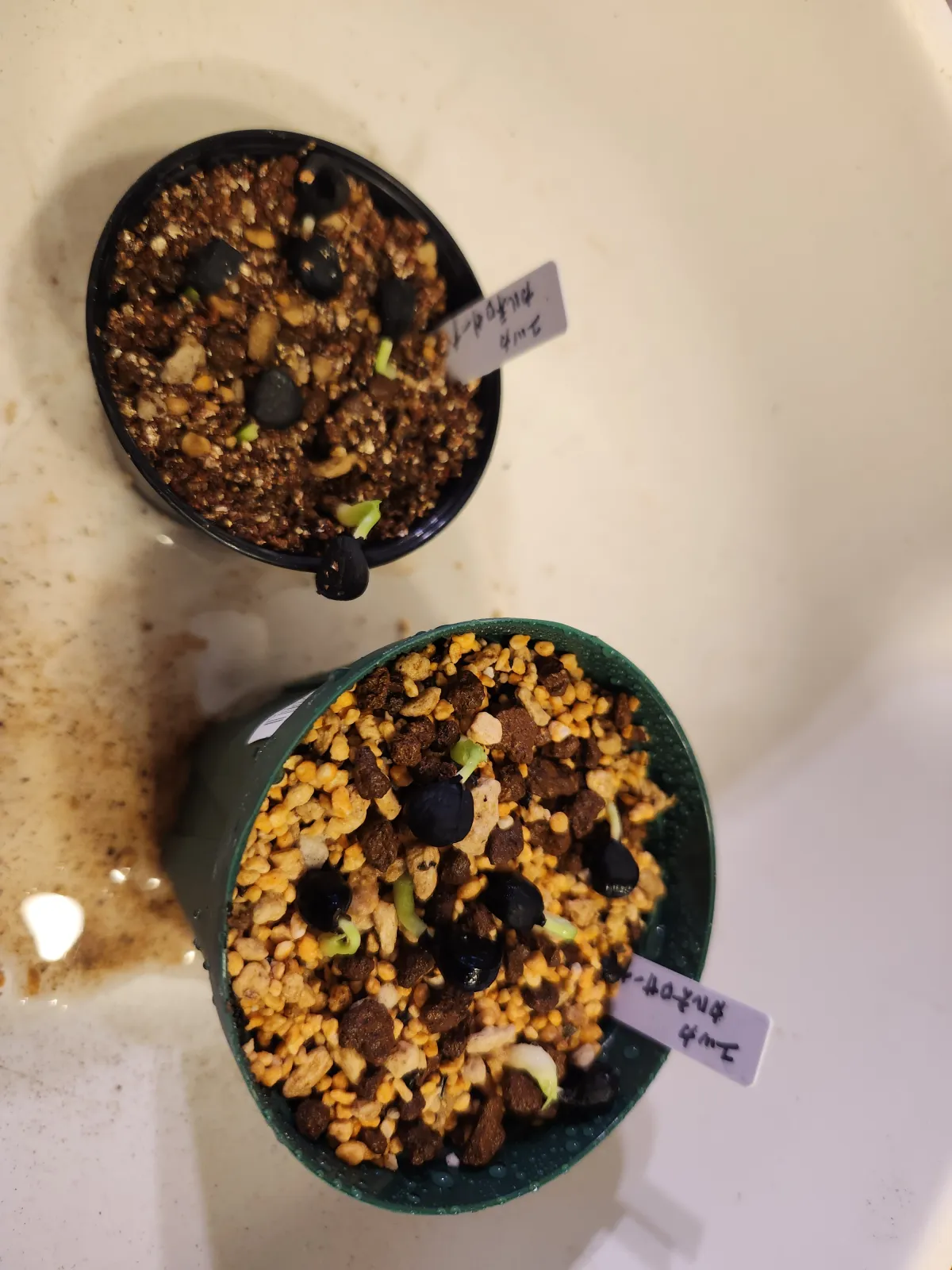 11/12粒発芽、播種後二週間。大型種子で吸水に時間がかかるようです。