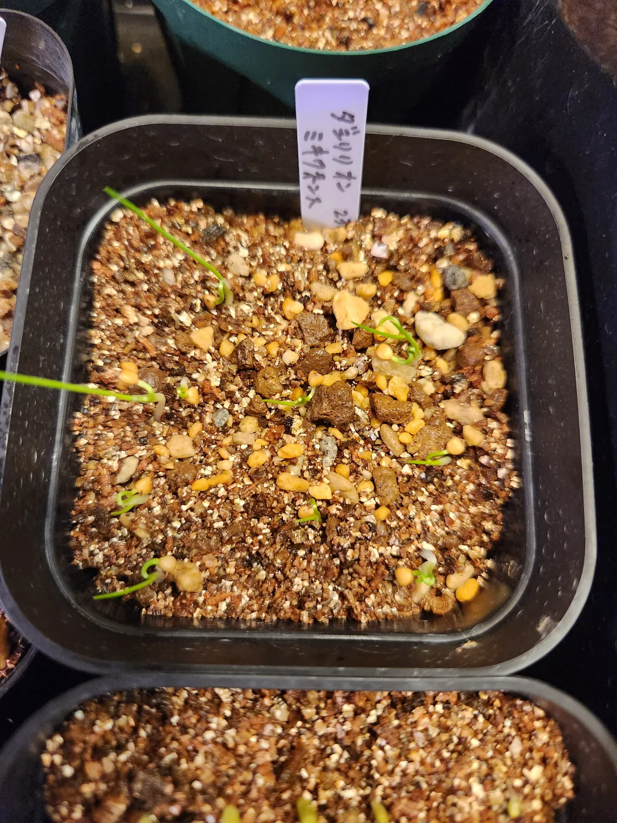 11/12粒発芽。早い個体で播種後2日。遅い個体で播種後一週間。湿度高めすぎると徒長が顕著かも。