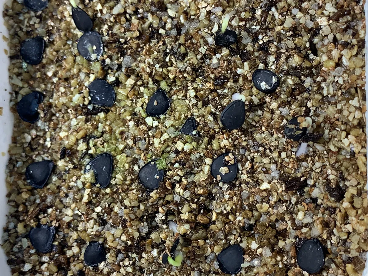 2023.4.13時点。ベンレート、メネデール、LED照射、腰水管理。25粒播種。7粒発芽。20粒購入なのでの発芽率換算すると35%