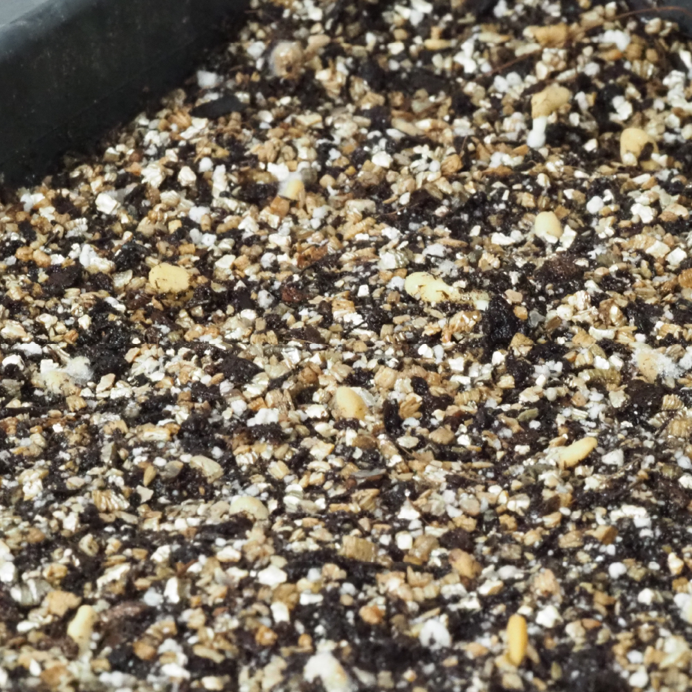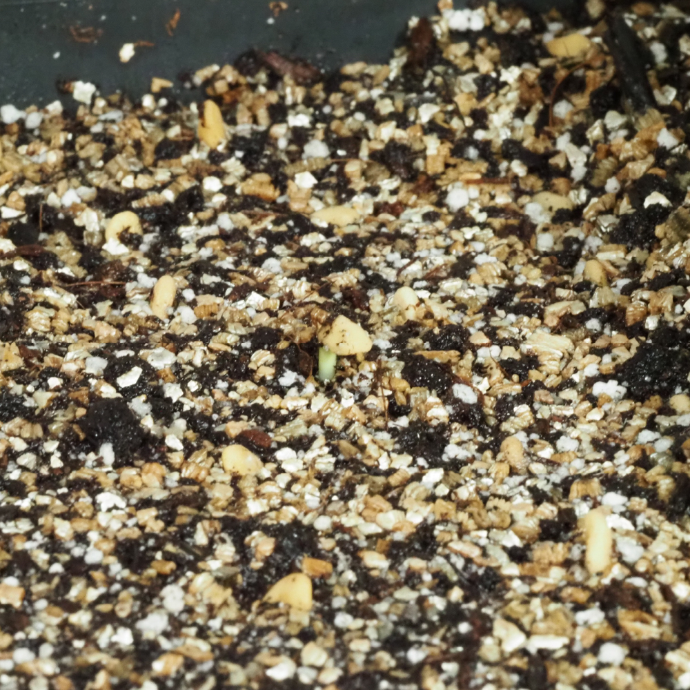 パキポディウム ラメレイ基本種です。リゾレックスに一晩浸漬、種まき用土に尖った方を刺すようにして並べています。カビているものもありますが、糸状菌は発生していません。