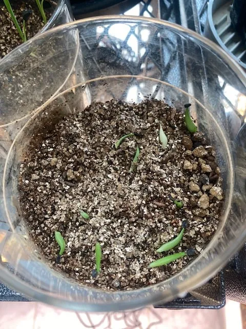 赤玉メインの用土に細目のバーミキュライトを敷き播種、25度〜30度で管理