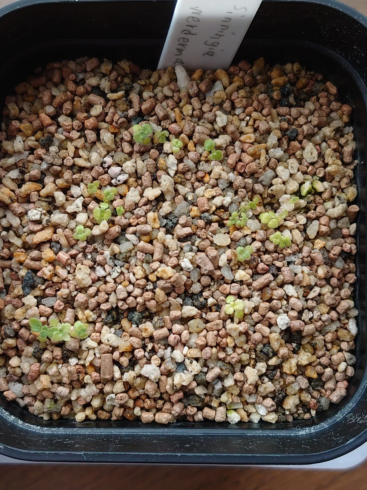 赤玉メインの用土にホームセンターで売ってる細か目のサボテン・多肉植物用土を敷き播種、15度〜28度で管理