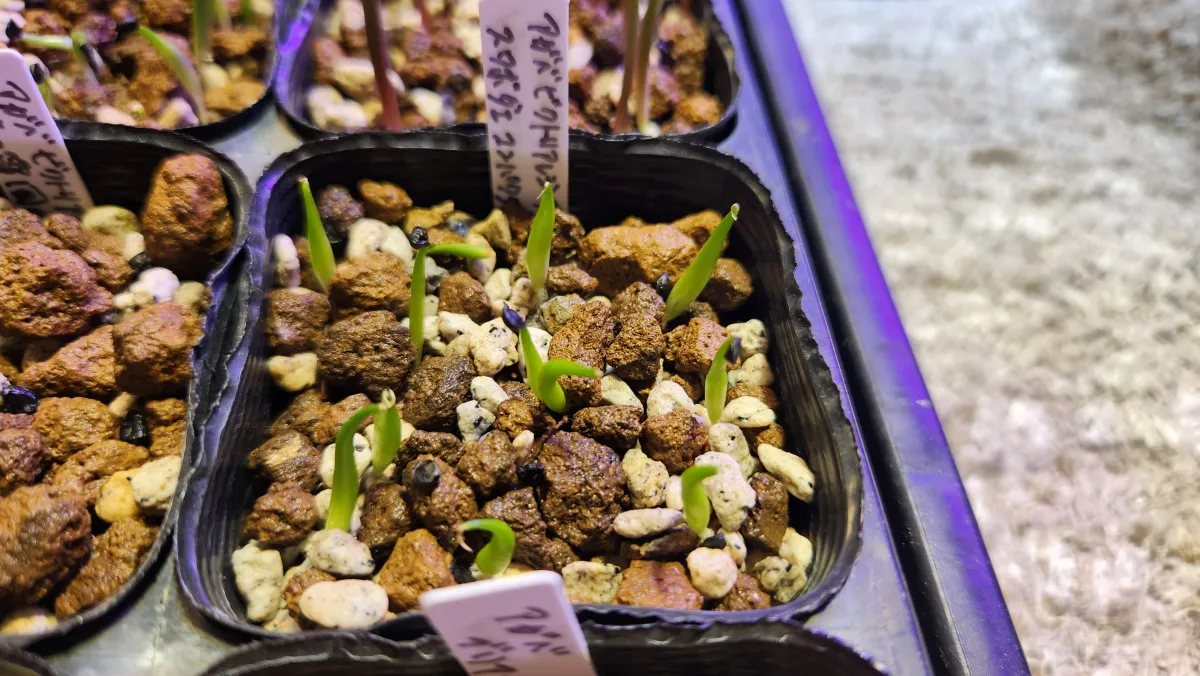 赤玉軽石パーライト少々、殺菌剤あり、腰水、屋外管理