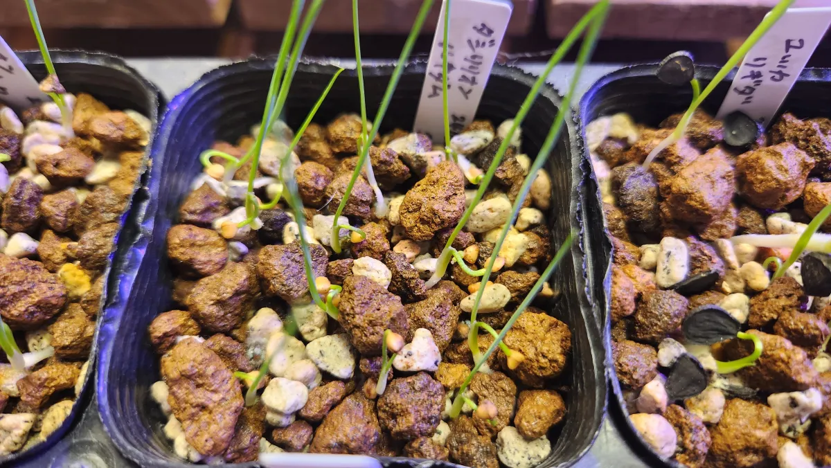 赤玉軽石パーライト少々、殺菌剤あり、腰水、屋外管理
