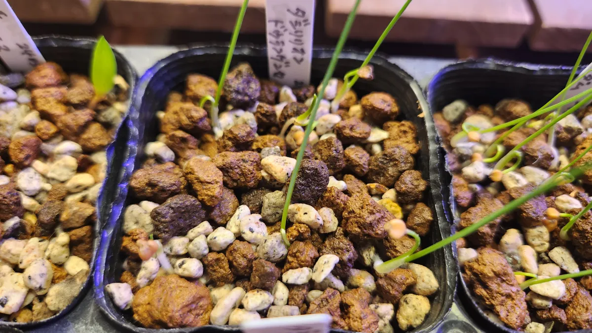 赤玉軽石パーライト少々、殺菌剤あり、腰水、屋外管理