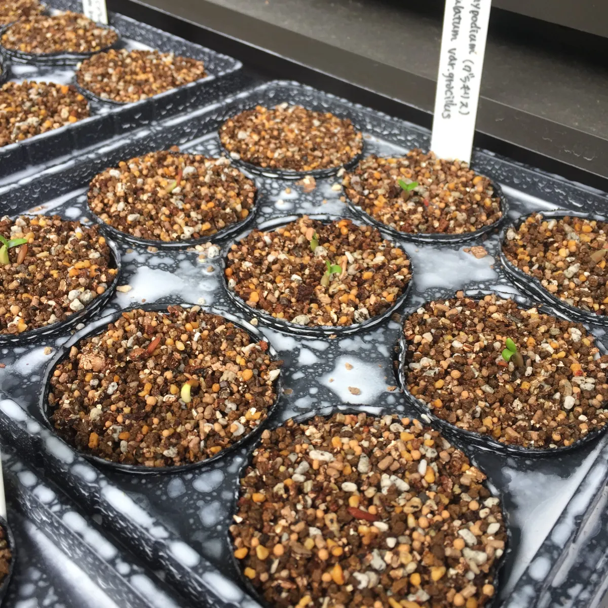5/28ダコニール、メネデールに種子を半日ほどつけ熱湯消毒し冷ました土(盆栽用土と多肉用土半々)に蒔きダコニールとメネデールを希釈した水で腰水。