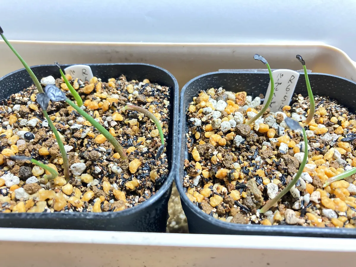 管理:腰水/窓際で半透明の蓋付き/発芽後は蓋取外し/1日1回、ベンレート希釈水を霧吹きで水やり