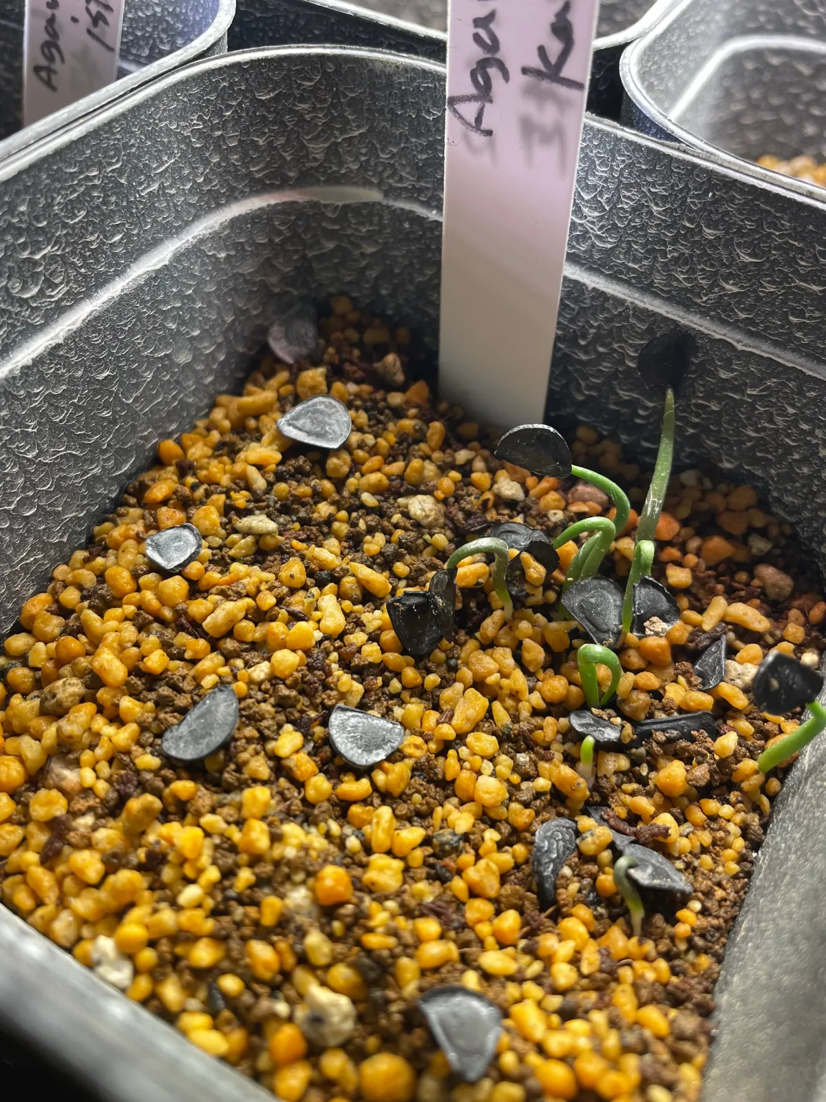 鉢底石に赤玉+鹿沼+種まき用土の上に播種。