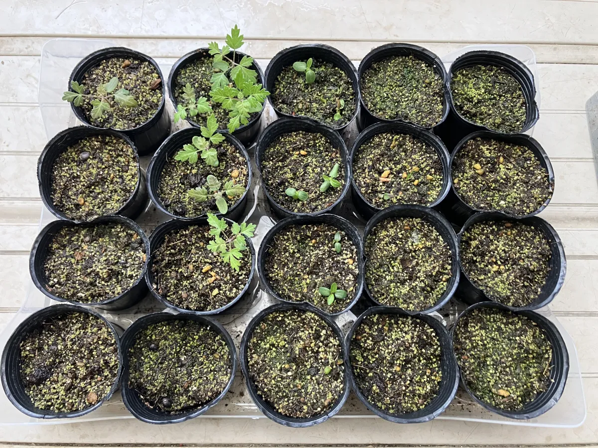 赤玉メインの用土に細目のバーミキュライトを敷き播種、20度〜25度で管理