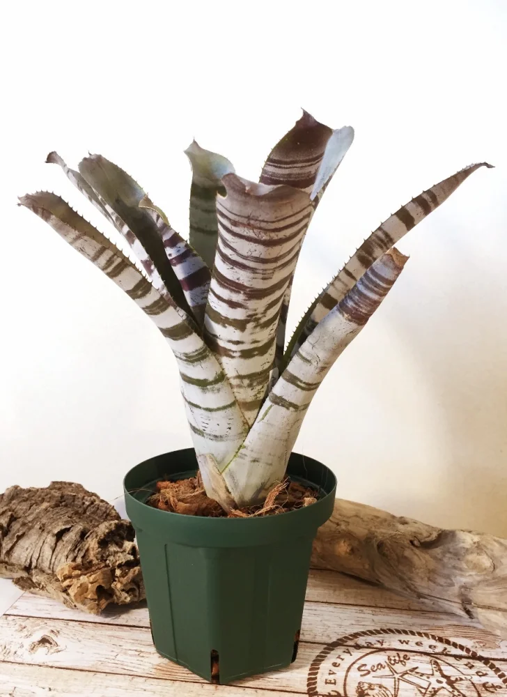 南米原産の大型タンクブロメリアで、黒褐色の硬い葉に鮮明なゼブラ模様(縞模様)が入ります。1mを超えるサイズになり、葉の付け根に水を貯める性質を持つ熱帯の着生植物です。橙色の花序から黄色い筒状の花を咲かせ、観賞価値が高いです。 大きなゼブラ柄(縞模様)が黒に近い褐色の葉に映える、非常に魅力的な外見です。 葉の幅・高さともに1m以上になることもある大型種です。エクメア属の中でも硬い葉(硬葉系)で、縁に棘(鋸歯)があります。 オレンジ色から黄色へ変化する美しい花苞(苞葉)が、数ヶ月間色褪せず観賞できます。